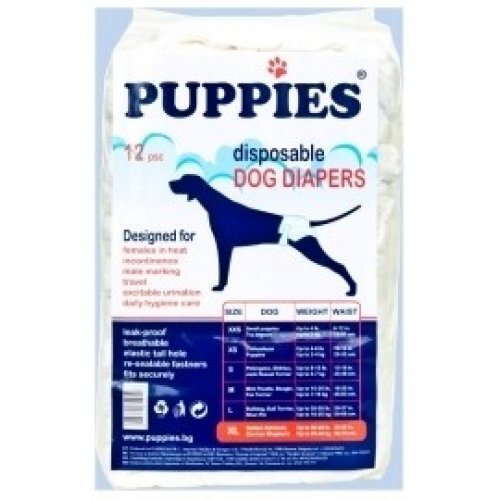 Пелените за еднократна употреба PUPPIES® са предназначени за кучета, с отвор за опашката, проектирани съобразно тяхната анатомия. Те са изключително практично решение за хигиена. Поставят се лесно чрез две самозалепващи ленти. Еластичността на пелената в двата й срещуположни края осигурява отлично напасване и комфорт за Вашия домашен любимец. За това допринася и дишащата материя, от която са направени тези пелени.Избор на подходящ размер може да се направи в съответствие с таблицата: Пелените за кучета PUPPIES® се използват най-често за женски в период на менструация, при пътуване, в случаи на животни страдащи от инконтиненция, както и като ежедневно решение за хигиена.Супер абсорбиращият полимер (S.A.P) в пелените за кучета PUPPIES® трансформира течността в гел, с което гарантира максимален комфорт и усещане за сухота. XXS: Най-малки Toy породи, до 2 кг, 15-30 см. XS: Чихуахуа, подрастващи, 2-4 кг, 25-33 см. S: Пекинез, Джак Ръсел Териер, 4-7 кг, 33-48 см. M: Мини Пудел, Бийгъл, Фокс Териер, 7-16 кг, 45-63 см. L: Булдог, Бул Териер, Шар Пей, 16-25 кг, 50-68 см. XL: Голдън Ретрийвър, Немска Овчарка, 25-40 кг, 63-76 см. НАЙ-ВАЖНИТЕ ТРИКОВЕ ВЪВ ВЪЗПИТАНИЕТО: Прекъснете кучето, когато ходи до тоалетна извън подложката си. И го преместете върху нея. НЕ го наказвайте, НЕ го удряйте, след като вече е извършило „престъплението“! То не разбира защо.Ако е отишло до тоалетна на неправилното място, веднага изчистете добре!Кучето маркира и запомня това място като „правилно“ чрез миризмата.