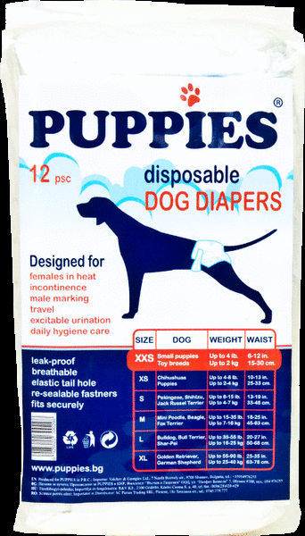 Puppies XXS - памперс-гащи за кучета с тегло до 2 кг. и талия 15-30 см. 12 броя