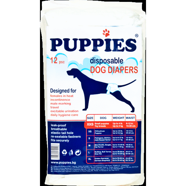 Пелените за еднократна употреба PUPPIES® са предназначени за кучета, с отвор за опашката, проектирани съобразно тяхната анатомия. Те са изключително практично решение за хигиена. Поставят се лесно чрез две самозалепващи ленти. Еластичността на пелената в двата й срещуположни края осигурява отлично напасване и комфорт за Вашия домашен любимец. За това допринася и дишащата материя, от която са направени тези пелени.Избор на подходящ размер може да се направи в съответствие с таблицата: Пелените за кучета PUPPIES® се използват най-често за женски в период на менструация, при пътуване, в случаи на животни страдащи от инконтиненция, както и като ежедневно решение за хигиена.Супер абсорбиращият полимер (S.A.P) в пелените за кучета PUPPIES® трансформира течността в гел, с което гарантира максимален комфорт и усещане за сухота. XXS: Най-малки Toy породи, до 2 кг, 15-30 см. XS: Чихуахуа, подрастващи, 2-4 кг, 25-33 см. S: Пекинез, Джак Ръсел Териер, 4-7 кг, 33-48 см. M: Мини Пудел, Бийгъл, Фокс Териер, 7-16 кг, 45-63 см. L: Булдог, Бул Териер, Шар Пей, 16-25 кг, 50-68 см. XL: Голдън Ретрийвър, Немска Овчарка, 25-40 кг, 63-76 см. НАЙ-ВАЖНИТЕ ТРИКОВЕ ВЪВ ВЪЗПИТАНИЕТО: Прекъснете кучето, когато ходи до тоалетна извън подложката си. И го преместете върху нея. НЕ го наказвайте, НЕ го удряйте, след като вече е извършило „престъплението“! То не разбира защо.Ако е отишло до тоалетна на неправилното място, веднага изчистете добре!Кучето маркира и запомня това място като „правилно“ чрез миризмата.