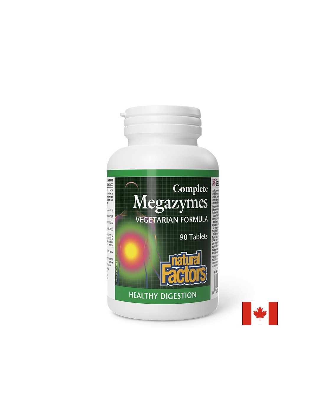 Complete Megazymes Vegetarian Formula на Natural Factors осигурява широк спектър от ключови храносмилателни ензими, необходими за пълноценно храносмилане. Този натурален продукт включва амилаза за подпомагане разграждането на въглехидратите като нишесте; липаза за разграждане на мазнините; и протеаза за разграждане на протеините на по-прости полипептиди. Протеолитичните ензими бромелаин и папаин също спомагат за разграждането на протеините, като същевременно поддържат здравословен възпалителен отговор. Бромелаинът е ензим намиращ се в стъблото на ананаса, а папаинът е извлечен от плодовете на папая. Папаинът насърчава храносмилането и намалява киселините, газовете и чувството за подуване.