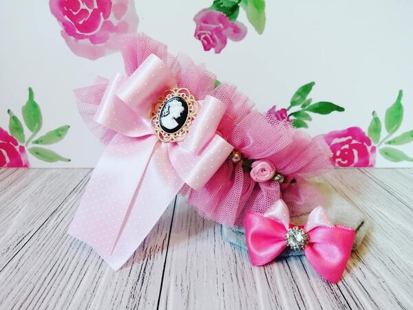 Подходящ за дребни породи. Размер на нашийника: от 20 до 27 см. обиколка на врата. Панделката е колосана,със захващане от два здрави груминг ластика. Размер на панделката: 5 х 3см. Комплектът е с много качествена ръчна изработка.