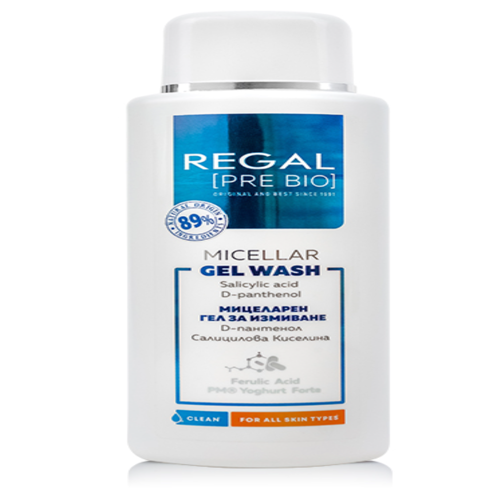 REGAL Мицеларен гел за измиване 200ml Нежен мицеларен гел с пробиотици за чиста и хидратирана кожа.Премахва излишния себум и остатъците от грим.Възстановява микробиотата и хидробаланса на кожата Съдържа D-пантенол и пробиотици Подходящ за ежедневна употреба