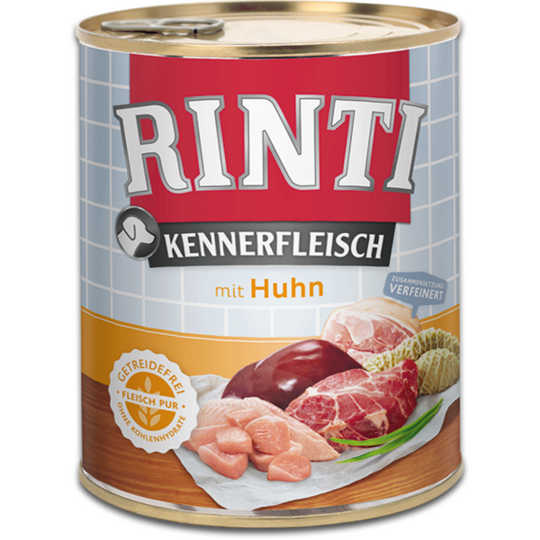 RINTI Kennerfleisch е гама от пълноценни консерви за кучета, направени от селектирани меса.  А самите консерви от серията RINTI Kennerfleisch са оптималната храна за младите кучета: тя съдържа късчета истинско месо, без формовано месо, без зърно, без овкусители, без животински брашна, без соя, без оцветители – само чисто месо. Съдържанието на месо в консервите Rinti е особено високо – около 70%! Останалата част се състои от: фибри, масла, витамини и минерали (общо около 5%), съобразени с дневните нужди на кучето Поради спецификата на производството се добавя вода, която в процеса на приготвяне се превръща в бульон. Към стандартната серия консерви Rinti не се прибавят никакви въглехидрати като паста, картофи, ориз и др. Добавени са фибри от червено цвекло. Въпреки че кучетата лесно обработват и усвояват месо, фибрите улесняват храносмилането за по-възрастните екземпляри и стабилизират деликатния стомашно-чревен тракт при подрастващите. За здравословната диета се препоръчва баланс на ненаситени мастни киселини. Консервите Rinti гарантират правилното съдържание на Омега 3 и 6, благодарение на естествените чисти меса, от които са направени. Състав: Бял дроб, пиле (13%), мускулно месо, бъбреци, кожа, шкембе, черен дроб, виме, минерали, ленено масло (0,2%), влакнини от цвекло (0,2%). Аналитичен състав: Протеини: 11 % Мазнини: 8 % Пепел: 2.5 % Фибри: 0.6 % Калций: 0.3 % Фосфор: 0.25 % Влажност: 77 % Хранителни добавки: Vitamin D3(E671): 200 IU/kg Vitamin E (3A700): 40 mg/kg Цинк (E6): 30 mg/kg   Инструкции за хранене Тегло на кучето (кг) Препоръчителна дневна доза (г/ден До 10 кг 1/2 консерва дневно До 20 кг 1 консерва дневно До 40 кг 2 консерви Това са препоръчителни количества. Порциите могат да варират в съответствие с възрастта, активността и темперамента на вашето куче. Винаги осигурявайте достъп до прясна и чиста вода.