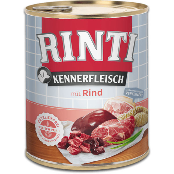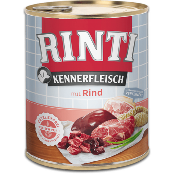 RINTI Kennerfleisch е гама от пълноценни консерви за кучета, направени от селектирани меса.  А самите консерви от серията RINTI Kennerfleisch са оптималната храна за младите кучета: тя съдържа късчета истинско месо, без формовано месо, без зърно, без овкусители, без животински брашна, без соя, без оцветители – само чисто месо. Съдържанието на месо в консервите Rinti е особено високо – около 70%! Останалата част се състои от: фибри, масла, витамини и минерали (общо около 5%), съобразени с дневните нужди на кучето Поради спецификата на производството се добавя вода, която в процеса на приготвяне се превръща в бульон. Към стандартната серия консерви Rinti не се прибавят никакви въглехидрати като паста, картофи, ориз и др. Добавени са фибри от червено цвекло. Въпреки че кучетата лесно обработват и усвояват месо, фибрите улесняват храносмилането за по-възрастните екземпляри и стабилизират деликатния стомашно-чревен тракт при подрастващите. За здравословната диета се препоръчва баланс на ненаситени мастни киселини. Консервите Rinti гарантират правилното съдържание на Омега 3 и 6, благодарение на естествените чисти меса, от които са направени. Състав: Говеждо месо (35%), бял дроб, мускулно месо, кожа, бъбреци, минерали, ленено масло (0,2%), влакнини от цвекло (0,2%). Аналитичен състав: Протеини: 11 % Мазнини: 8 % Пепел: 2.5 % Фибри: 0.6 % Калций: 0.3 % Фосфор: 0.25 % Влажност: 77 % Хранителни добавки: Vitamin D3(E671): 200 IU/kg Vitamin E (3A700): 40 mg/kg Цинк (E6): 30 mg/kg Инструкции за хранене Тегло на кучето (кг) Препоръчителна дневна доза (г/ден До 10 кг 1/2 консерва дневно До 20 кг 1 консерва дневно До 40 кг 2 консерви Това са препоръчителни количества. Порциите могат да варират в съответствие с възрастта, активността и темперамента на вашето куче. Винаги осигурявайте достъп до прясна и чиста вода.