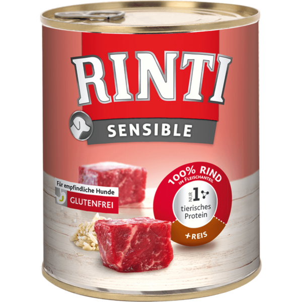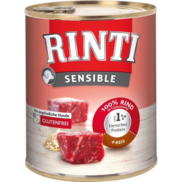 Rinti Sensible са специални, пълноценни консерви от селектирани меса за кучета със специални нужди, които не толерират всички храни или проявяват алергични реакции към определени компоненти. Внимателно подбрана гама консерви за кучета със специални нужди от разнообразни селектирани меса. Само чисто месо, без соя и оцветители. Добавени са хранителни фибри за подобрено храносмилане. Приоритет при производството на тази храна е и добрият ѝ прием от страна на животните, тъй като чувствителните към храни кучета нерядко са капризни и страдат от липса на апетит. Чрез обогатяването с баластни вещества се увеличава времето, през което храната престоява в храносмилателната система, като по този начин могат да бъдат усвоени всички полезни хранителни вещества. Единственото използвано месо е говеждо месо. Съдържа видими естествени парчета месо и ориз. Много вкусен и лесно смилаем от кучета с храносмилателни проблеми. Състав: 59% говеждо месо (шкембе, виме, черен дроб, мускулно месо, бял дроб, бъбреци), 5% Аналитичен състав: Протеини: 9 % Мазнини: 7 % Пепел: 2 % Фибри: 0.5 % Влажност: 79 % Хранителни добавки: Vitamin D3(E671): 200 IU/kg Vitamin E (3A700): 20 mg/kg Цинк (E6): 13 mg / kg   Инструкции за хранене Тегло на кучето (кг) Препоръчителна дневна доза (г/ден До 7 кг 400 До 16 кг 800 До 40 кг 1600 Това са препоръчителни количества. Порциите могат да варират в съответствие с възрастта, активността и темперамента на вашето куче. Винаги осигурявайте достъп до прясна и чиста вода.