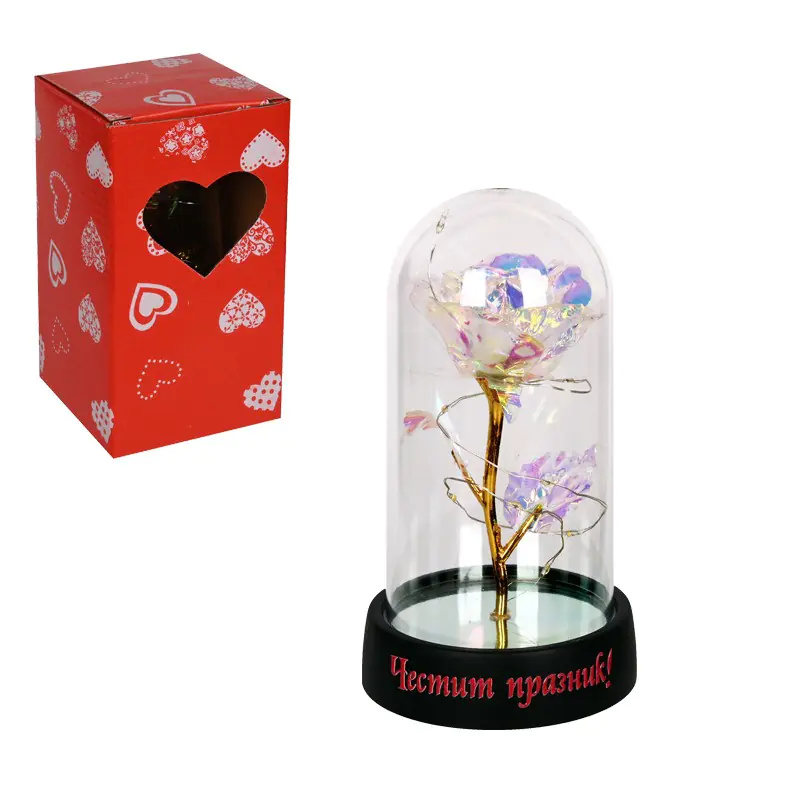 Роза с послание Честит Празник! в стъклен купол със LED светлини.