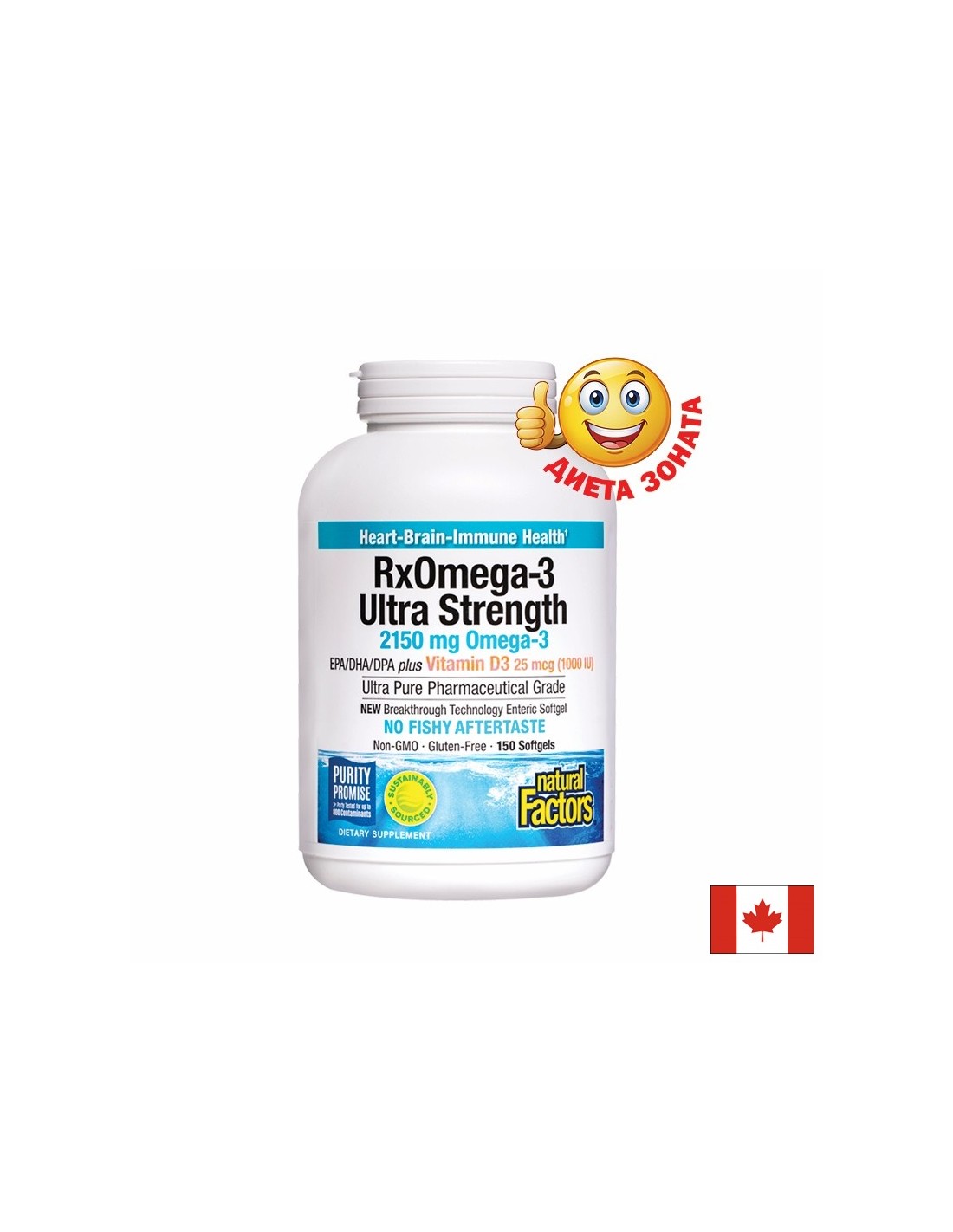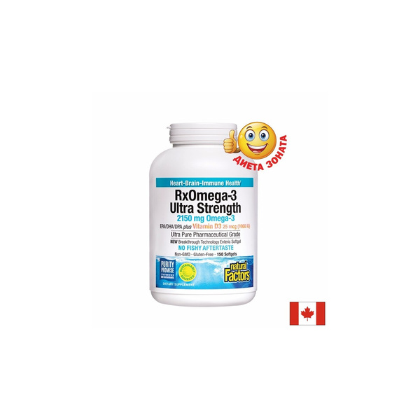 RX OMEGA-3 ULTRA-STRENGTH на Natural Factors допринася за нормалното функциониране на мозъчната и сърдечно-съдовата системи, укрепва ставите и костите, както и поддържа нормална концентрацията на триглицеридите.