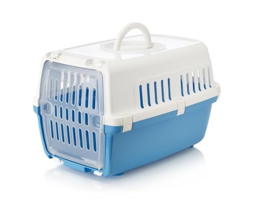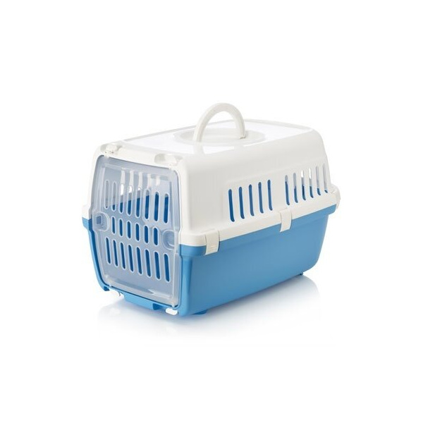 Модерна транспортна чанта с прозрачна пластмасова врата с четириточково сигурно заключване за котки и кучета до 5 кг. Предлага се в цветове студено сиво/бяло и морско синьо/бяло.