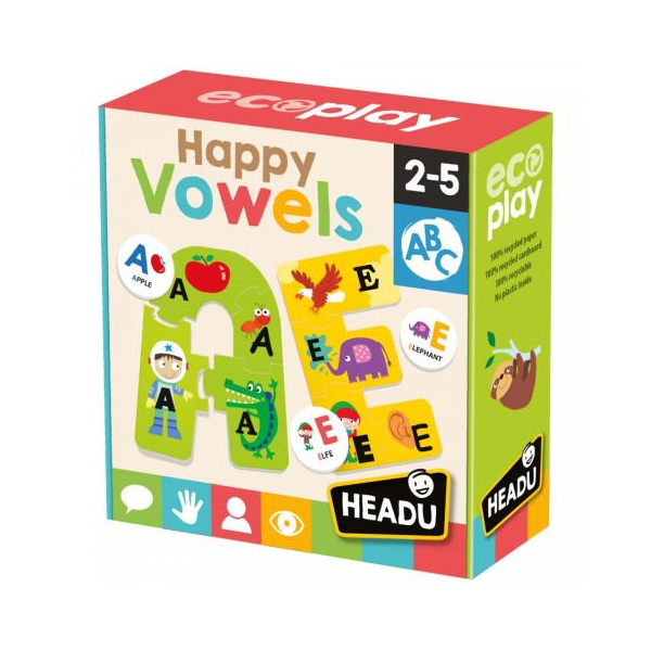 Щастливи гласни букви е цветен и образователен пъзел за деца, които докато си играя, учат по забавен начин. Насърчва логическото мислене, паметта, помага лесно да се научат буквите и правилното произнасяне на звуковете в думата. Пъзела е полесен за цялостното интелигентно развитие на детето. Подходящ за деца между 2 - 5 години.