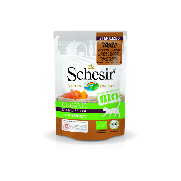Натурална и вкусна: Schesir Bio в паучове е котешка храна със сертифицирано био качество, която впечатлява със своята балансирана рецепта и апетитен вкус. Тя достига до вас опакована в практична опаковка пауч.При производството на тази био храна се използват изключително само подбрани, екологичночисти суровини. Нейната най-важна съставка са животинските протеини, което се дължи на факта, че по природа котките са месоядни животни - така осигурявате на любимеца си природосъобразно меню. Освен това храната се отличава със своята отлична смилаемост и е подходяща за самостоятелно хранене на котки от всички породи. Тя не съдържа изкуствени добавки като оцветители и консерванти.Висококачествена консервирана храна за котки