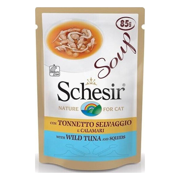 Допълваща мокра храна за възрастни коткиС филета от вкусна риба тон в комбинация с калмари. Предлага се в супа за котки, които обичат мократа храна Schesir и особено течната част.Страхотен сам по себе си като натурална порция, а също и идеален за сервиране, смесен с гранули за допълнителен вкус.