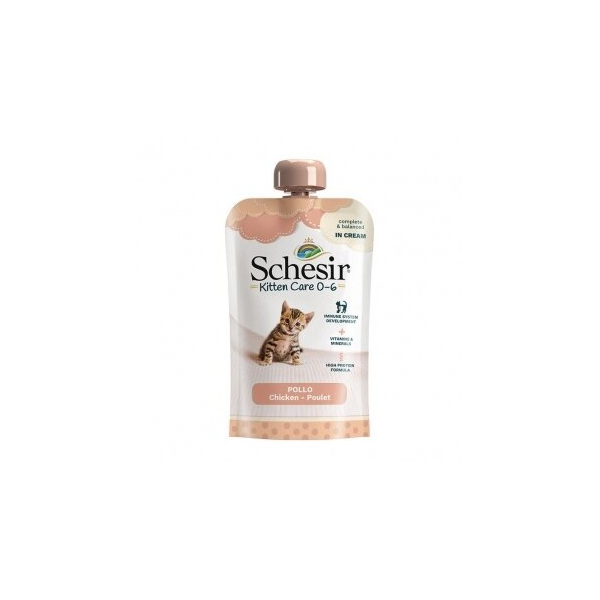 Рецепта на базата на истински пилешки филенца в гладък крем, идеален за отбиване.Тази високопротеинова храна с витамини и минерали е идеална за развитие на имунната система на котенца от 0 до 6 месеца.Удобната опаковка от 150 g с капачка се грижи за чести малки хранения през целия ден.
