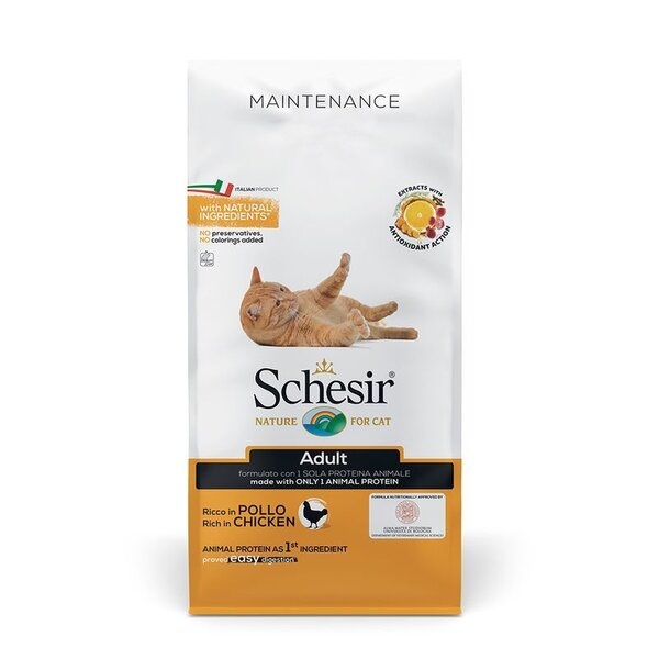 Хипоалергенна суха храна за котки, с естествени съставки и плюс витамини, минерали, пребиотици, таурин и билки, за здраве и благополучие, монопротеинов източник. Тази хипоалергенна и лесно смилаема суха храна е тествана и препоръчана от Ветеринарния институт на университета в Болоня. Той взема предвид хранителните нужди на възрастни котки, независимо от породата, за да им помогне да останат здрави. Рецептата съдържа бирена мая, биотин, омега 3 и 6 мастни киселини, важни съставки, които поддържат имунната система и насърчават здравата кожа и козина. С пилето като единствен източник на животински протеин, Schesir Adult се понася добре от чувствителни животни и може да се храни и в случай на алергии към други източници на протеин. Пребиотиците, лененото семе и бирената мая поддържат баланса в стомашно-чревния тракт и по този начин спомагат за по-доброто усвояване и използване на хранителните вещества. В комбинация с екстракт от юка, регулиращите храносмилането съставки помагат и за намаляване на неприятната телесна миризма и миризмата на изпражнения. Специалната комбинация от подправки със синергичен антиоксидантен ефект (грозде, цитруси, карамфил, куркума, розмарин) помагат на организма да се бори със свободните радикали Schesir е една от водещите марки натурални храни за домашни любимци от 1986 г. насам. Всички разновидности на италианския първокласен производител са направени от 100% натурални съставки, не съдържат оцветители и консерванти и се произвеждат без използването на тестове върху животни Schesir Adult Maintenance с пиле с един поглед: Премиум суха храна за котки, подходяща за всички породи и възрасти 100% натурален: само висококачествени, естествени съставки Тестван в университета: рецептата е призната от Ветеринарния институт на университета в Болоня Чувствителност на кожата: бирена мая, биотин, омега 3 и 6 мазни поддържат киселини имунната система и подпомага здравето на кожата и козината Антиоксиданти: съдържа подправки със синергичен антиоксидантен ефект Единствен източник на протеин: Пилешкото като единствен източник на животински протеин, хипоалергичен, може да се храни и при непоносимост Балансирано храносмилане: с пребиотици, ленено семе и бирена мая, регулира стомашно-чревния тракт и по този начин подпомага оптималното използване на хранителните вещества Пълна жизненост: балансирана рецепта с много витамини, минерали и микроелементи Ценни растителни екстракти: с ленено семе, слънчогледово масло и екстракти от розмарин, карамфил, куркума, както и грозде и цитрусови плодове Съдържа таурин: поддържа сърцето и зрението С екстракт от юка: може да намали миризмата на изпражненията Без цветове или консерванти Без жестокост: произведено без тестване върху животни Сигурен произход: традиционна първокласна марка от Италия с устойчива корпоративна философия Състав:28% дехидратирано пиле, ориз, ечемик, пречистена животинска мазнина, картофен протеин, царевичен глутен, изсушена пулпа от цвекло, 1% бирена мая, ленено семе, грахово брашно, слънчогледово масло, 1% фруктоолигозахариди (FOS), 1% пулпа от цикория, натриев пирофосфат, калиев хлорид, 0,1% мохаве палмова лилия, 0,03% сушени ароматни растения (грозде, цитрусови плодове, карамфил, куркума, розмарин).