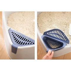 В комплекта има още лопатка за по-лесно почистване и контейнерче, което може да се използва като помощно средство при почистване, а през останалото време може просто да се използва като решетка, на която Вашето коте да си изтупа лапичките от полепналата постелка при използването на съда.