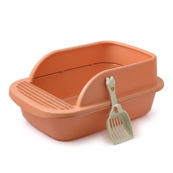 Отворен съд за котешка тоалетна, с високи странични бордове, за да се предотврати разпръскването на постелка отвън.