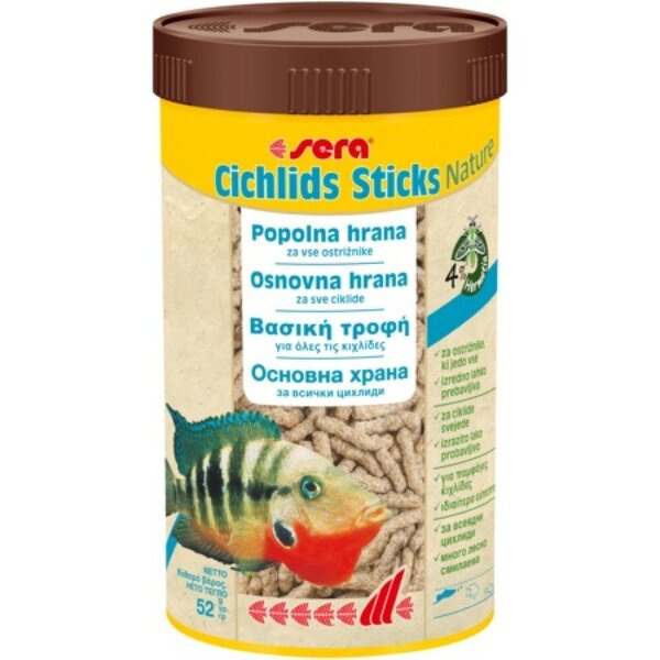 Храна за рибки Сichlids Sticks Nature е произведена в Германия от един от лидерите в бранша - Sera. Това е плаваща храна във вид на гранули, подходяща за основно хранене на всички видове цихлиди и други едри риби. Предлага се в разфасовки от 1 000 и 10 000 мл. Произвежда се без изкуствени оцветители. Специалният производствен процес гарантира, че дори и по-малките риби ще се доберат до своята порция без храната да се разложи и да замърси аквариума. Съдържа висок процент въглехидрати и по-малко протеин. Основна храна за големи цихлиди sera Cichlids Sticks Nature е основната храна без оцветители и консерванти, състояща се от нежно произведени пръчици за по-големи всеядни цихлиди – като много южноамерикански видове – и други големи риби. Пръчиците са особено вкусни, поради високото си количество на оптимално усвоим протеин от устойчива храна от риба и насекоми, както и омега мастни киселини. Балансираната диета подкрепя жизнеността и здравословното развитие на рибата. Плаващите пръчки запазват формата си и не замърсяват водата. Препоръчителен размер на животните средно голямо Зона на плуване повърхноста Естествено хранене на декоративни риби Този продукт принадлежи към продуктовата линия "sera Nature", която не съдържа никакви оцветители или консерванти. Разнообразната диета с натурални съставки е най-добрата защита срещу недостига и подкрепя здравето и жизнеността на рибите. Поради тази причина, продуктовата линия "sera Nature" съдържа естествени съставки като спирулина, крил или устойчиво брашно от ларвата на мухата (Hermetia). Етикетите на лицевата страна на опаковката показват тези съставки и тяхното количество в храната. Съдържание: рибно брашно, пшенично брашно, пшенични зародиши, пшеничен глутен, пшенично нишесте, бирена мая, брашно от гамарус, рибно масло. Качествен анализ: протеин - 48.4%, мазнини 6.2%, влакнини 2.1%, витамини - A, B1, B2, С, D3, E