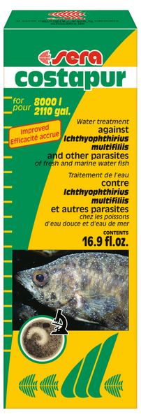 Sera Costapur е препарат против едноклетъчното Ichthyophthirius и други паразити по рибките (Costia, Chilodonella, Trichodina и др) в сладководния и соленоводния аквариум. Повишаване на температурата с няколко градуса (в зависимост от вида на рибката) и аерацията ще повишат ефекта.
