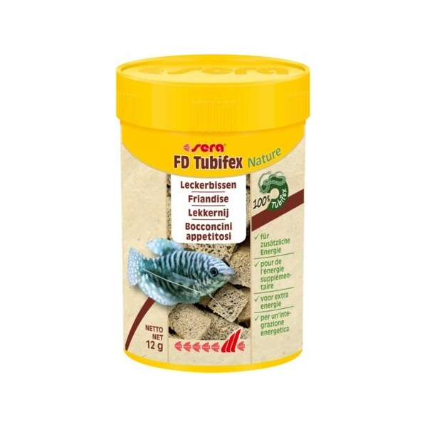 Живият тубифекс се пречиства внимателно, веднага се замразява и влажността се изтегля под вакуум. Хранителната стойност на Sera Tubifex Nature значително се повишава, ако се прибавят 1-2 капки Serafishtamin пет минути преди храненето.