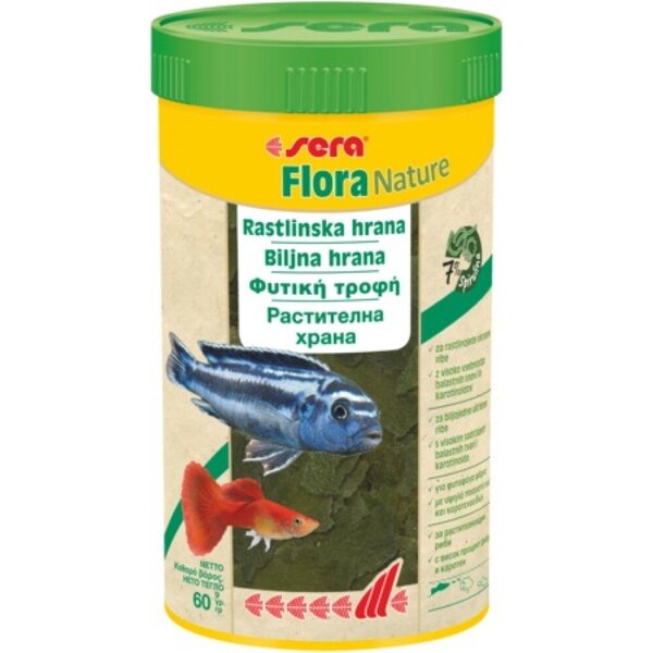 sera Flora Nature е растителна храна за всички растителноядни декоративни риби, хранещи се на водната повърхност, която не съдържа оцветители и консерванти.