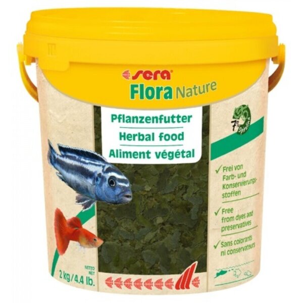 sera Flora Nature е растителна храна за всички растителноядни декоративни риби, хранещи се на водната повърхност, която не съдържа оцветители и консерванти.