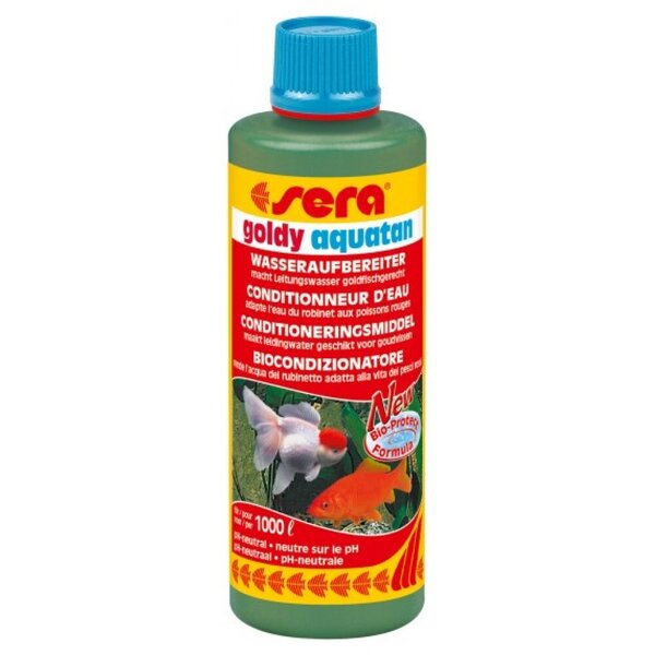 Sera Goldy Aquatan е подобрител за вода, подходящ за аквариуми със златни рибки. С негова помощ се кондиционира чешмяната вода според изискванията на златните рибки с неутрално pH.