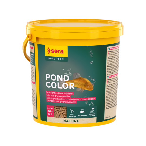 Pond Color е оцветяваща храна за езерни риби, направена от нежно произведени пръчици без оцветители и консерванти.Ценни съставки като брашно от крил (4%), което е много богато на естествени каротеноиди, спомагат за оптимално развитие на цвета и чистота на цветовете. Балансираната, лесно смилаема рецепта с изобилие от омега мастни киселини, витамини, микроелементи и минерали подпомага здравословното развитие, устойчивост и жизненост.Оцветяващата храна е подходяща за целогодишно пълноценно хранене. Плаващите пръчици запазват формата си дълго време и не замърсяват водата.