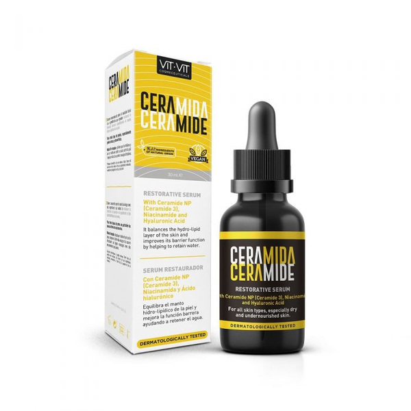 Серамидите - това са липиди (мазнини), които се срещат естествено и във високи концентрации в горния (роговия) слой на кожата и представляват 50% от нейния състав. Заедно с холестерола и мастните киселини те формират липидната матрица, която осигурява бариерната функция на кожата. Серамидите действат като свързващи звена между епидермалните кожни клетки. Основната им функция е да уплътняват кожната бариера, да защитават по-дълбоките слоеве на кожата, да предотвратят загубата на влага и да предпазват обвивката от агресивното въздействие на околната среда. Серамидите са известни със своите анти-стареещи и хидратиращи свойства. Те са естествена съставка в структурата на епидермиса и са подходящи за всички типове кожа. Серамидите поддържат динамиката на жизнените процеси в кожните слоеве и имат особено важен принос за поддържане на плътността, еластичността, гладкостта и младежкият вид на кожата. С течение на времето, а също и с постоянното излагане на увреждащи кожата фактори в ежедневието - замърсяване, слънчеви лъчи, както и естествения процес на стареене намалява възпроизводството на Серамиди, като до около 40-45 годишна възраст спира окончателно. Липсата им води до прекомерна сухота, а това от своя страна излага вътрешните слоеве на различни токсини и алергени от околната среда. Серумът за лице със Серамиди е иновативно и ефективно решение на Laboratorios Diet Esthetic от линията им за Грижа за лице VIT VIT Cosmeceuticals. Съдържа концентрация от най-съвременни активни съставки, предназначен е да подпомага възпроизводството на Серамиди, да възстановява естествената бариерна функция на кожата, като балансира нейния защитен хидро-липиден слой. Овлажняващ и възстановяващ, предпазва кожата от изсушаване и вредни външни фактори като замърсяване, вятър, замръзване или слънчева светлина. Активните съставки спомагат за задържането на влага в кожата и предотвратяват загубата на еластичност, в резултат на това кожата е перфектно хидратирана и подхранена. Подходящ за нанасяне преди крем за лице, като основа, а също и самостоятелно - препоръчително за нощна грижа. Съдържа 96,8% натурални съставки, добити от биологичното земеделие. За всички типове кожа, особено за грижа за суха кожа. Възраст: 30+