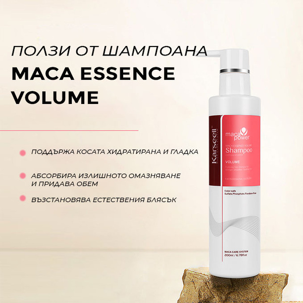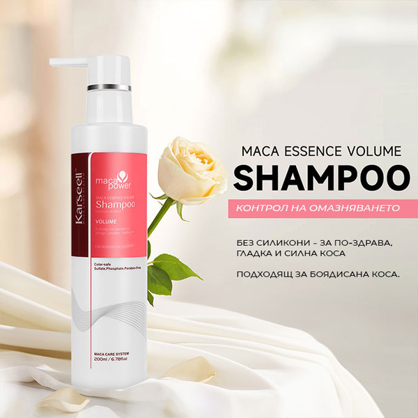 Шампоанът за обем Karsell Maca Essence възстановява косата, като я подхранва с арганово масло и ревитализиращи хранителни вещества. Придава обем и блясък. Резултат още след първата употреба.