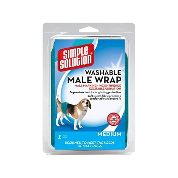 Simple Solution Washable Male Wrap - супер удобни и меки памперс-колани за мъжки кучета. Перящите се пелени ще предпазаят дома ви от напикаване и ще възстановят спокойствието в него. Супер абсорбиращата подложка от микрофибър в основата на тези памперси улавя влагата, а еластичната лента и прибиращите се закопчалки осигуряват плътно прилягане. За оптимално прилягане измервайте талията на кучето близо до задните му крака.  Вашето куче ще остане сухо и ще се чувства комфортно с влагозащитната подложка на Simple Solution, която предпазва кожата и козината му, а опънатата лента на кръста позволява дори на най-въртящите се момчета да се движат сигурно и уверено. Simple Solution Washable Male Wrap са създадени за кучета, които се обучават вкъщи, изпитват възбудимо уриниране или инконтиненция. Също така правят пътуването по-малко стресиращо за лаещия ви приятел.