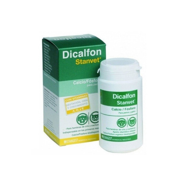 Dicalfón има специална формула, която съдържа органични калций / фосфор и витамини A, D 3 и E. Това е важен източник на витамини и минерали, от съществено значение за кучетата през първите няколко месеца от живота си, особено по време на никнене на млечни зъби и етапа на основния растеж.
