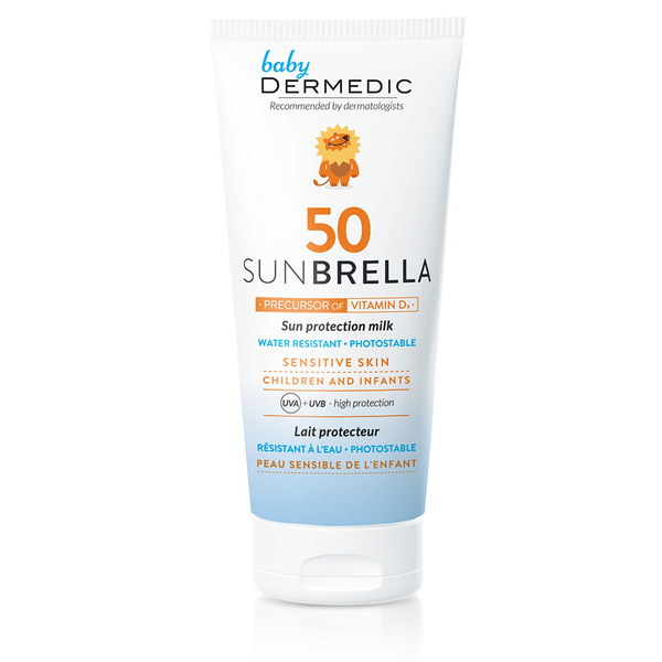 Слънцезащитното мляко за деца с фактор 50 Dermedic Sunbrella създава защитен филм на кожната повърхност, който защитава кожата от UV лъчите, проникващи в нея. Съдържа единствено минерални филтри. Облекчава раздразненията, успокоява, намалява усещането за парене, облекчава заздравяването и ускорява регенерацията. Интензивно хидратира сухата кожа в дълбочина, оставяйки я гладка и гъвкава. Може да се използва за деца над 6 месечна възраст.