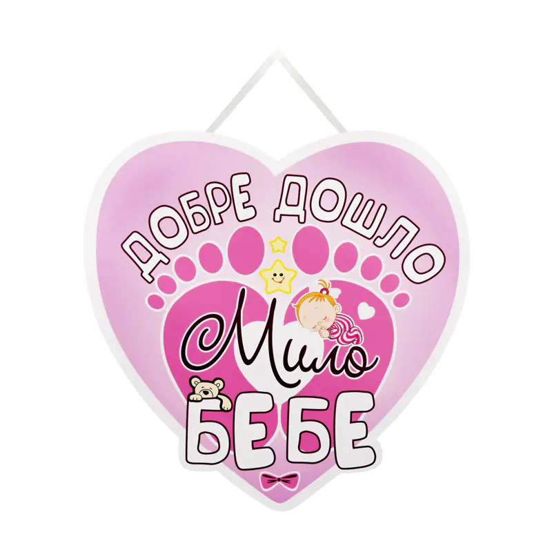 Табела в розово с надпис Добре дошло мило бебе във формата на сърце.