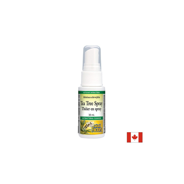 Спреят с чаено дърво на Natural Factors е естествено антибактериално почистващо средство в подходяща спрей бутилка. Подходящ за дезинфекция на порезни рани и драскотини. Използва се и за лечение при въшки и гниди, облекчава симптомите при акне и екзема и е естествен репелент срещу насекоми.