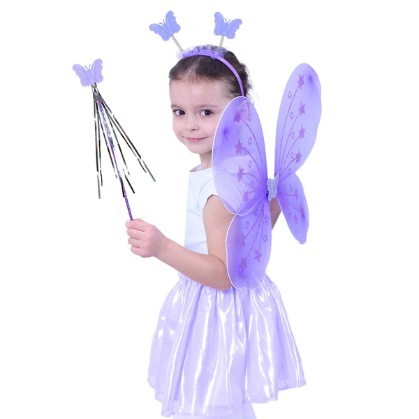 Сладките лилави крилца на пеперуда на ластик са предназначени за момичета на възраст 3-10 години (104-150 см). Този театрален комплект включва също диадема за глава с пеперудки на пружина и вълшебна пръчка. Материал: текстил, пластмаса, метал