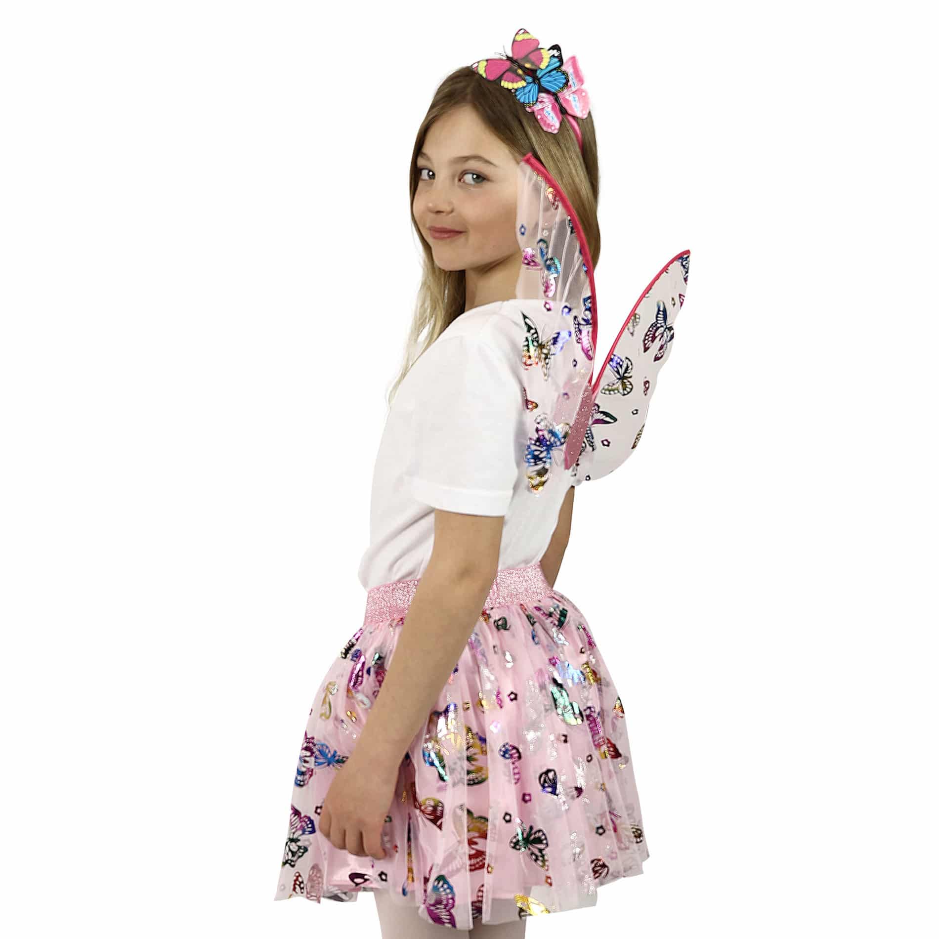 Сладката ТУТУ пола е предназначена за момичета на възраст 3-7 години (104-146 см), обиколка на талията 52-80 см. Пухкава розова пола с щампа на цветни пеперуди е ок. 32 см дължина. Този комплект включва сензационна диадема за глава и идеално съчетани крила. Материал: тюл, текстил, метал, пластмаса Размери на опаковка: 50×58×2 см Възраст: 3+