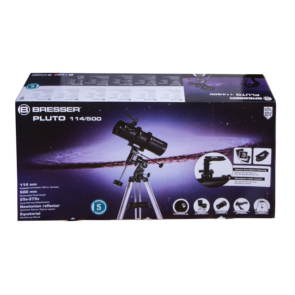 <p>A small reflecting Bresser Pluto 114/500 telescope is a perfect choice for travelers; you can easily take it with you anywhere you go. A novice astronomer as well as an experienced explorer can work with this optical tool. In spite of its small size, Bresser Pluto 114/500 features quality optics and delivers a high quality image. Moreover, this telescope has a large mirror with a wide field of view.</p>