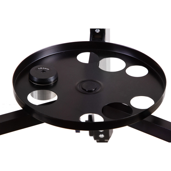 <p>В комплекта е включен също и алуминиев триножник. Височината на неговите крака може да се регулира, което позволява инсталиране на телескопа дори върху неравна повърхност. В набора е включена поставка за принадлежности.</p>