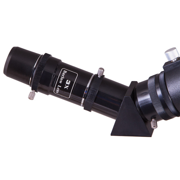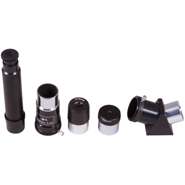 <p>Комплектът включва диагонална призма, която предава вертикално (неизкривено) изображение. Поради това телескопът е подходящ и за наземни наблюдения – той може да се използва като мощна зрителна тръба. Комплектът включва също така окуляри с увеличение 67x и 20x, леща на Барлоу с увеличение 3x и соларен филтър. Най-голямото практическо увеличение на този телескоп е 140x. Оптичният визьор 5x24 дава възможност за бърза навигация към наблюдавания обект в нощното небе. С принадлежностите директно от кутията можете да получите увеличение 200х.</p>