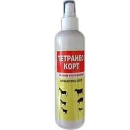 ТЕРАПЕВТИЧНИ ПОКАЗАНИЯ: тетранеокорт спрей е разтвор с антимикробен, антиалергичен и противовъзпалителен ефект. Той е високо ефективен при лечение на повърхностни случайни и операционни рани, при недълбоки контузни наранявания, при липса на некротични и размачкани тъкани и своевременно направена щателна хирургическа обработка, при интердигиталния дерматит и копитния гнилец.