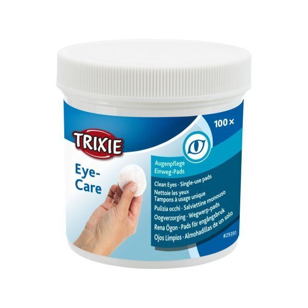 Поддържането на зоната около очите чиста е лесно и бързо с почистващите тампони Trixie. Тези предварително напоени, готови за употреба тампони са напоени с нежен лосион, който ефективно премахва прах, мръсотия, гурли и оцветявания от сълзи.