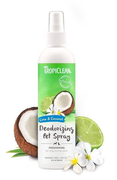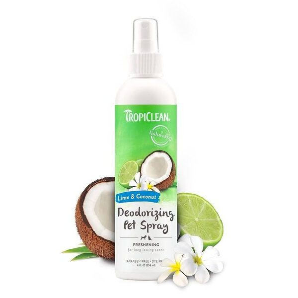 TropiClean дезодориращ спрей за домашни любимци поддържа и успокоява, тъй като разгражда лошите миризми при техния източник, като ефективно освежава вашето куче, котка и дом. Продуктите за домашни любимци TropiClean не са тествани върху животни.