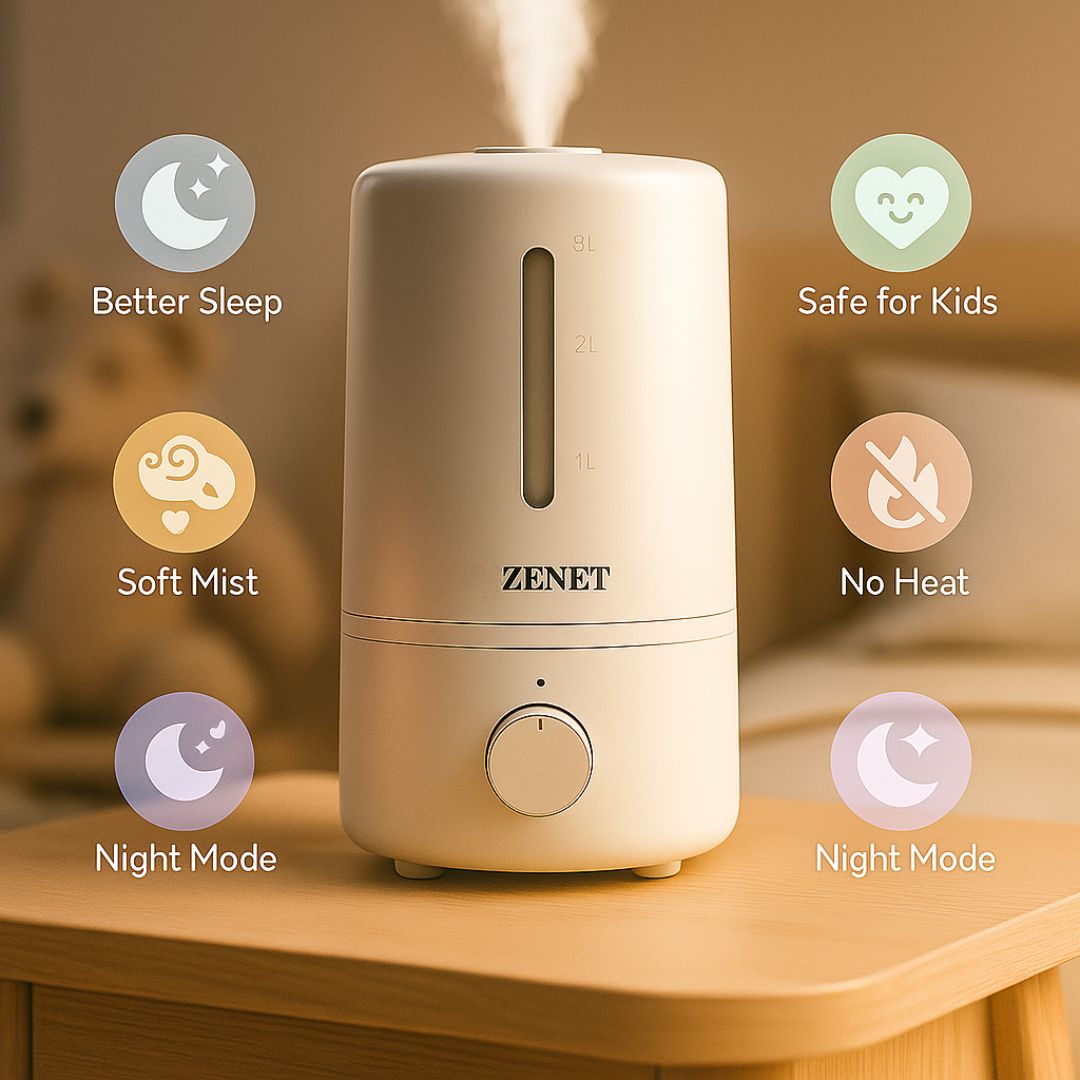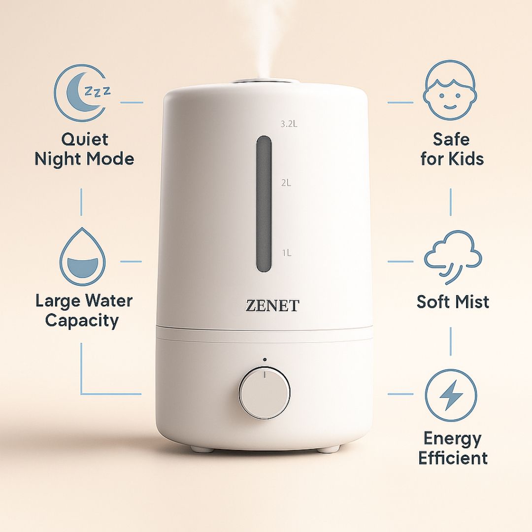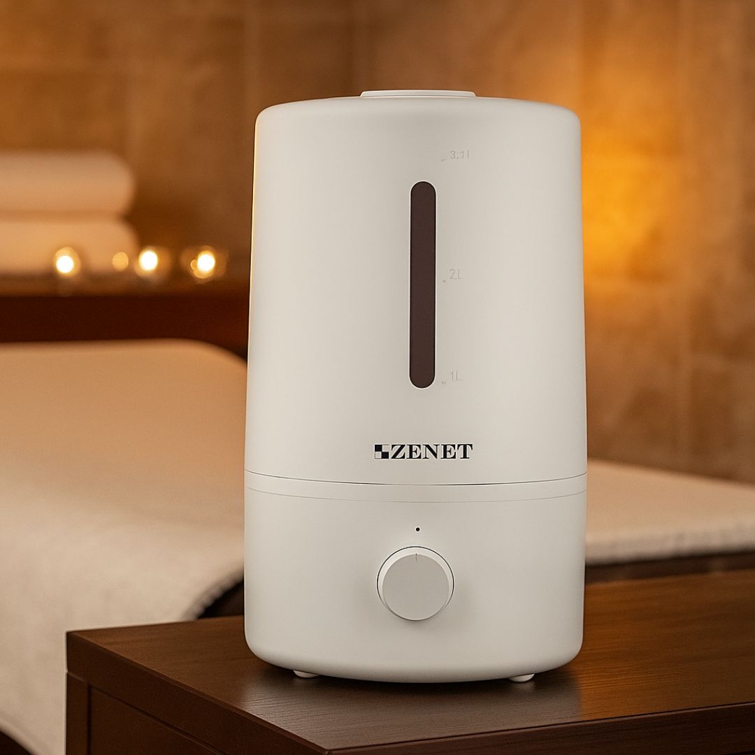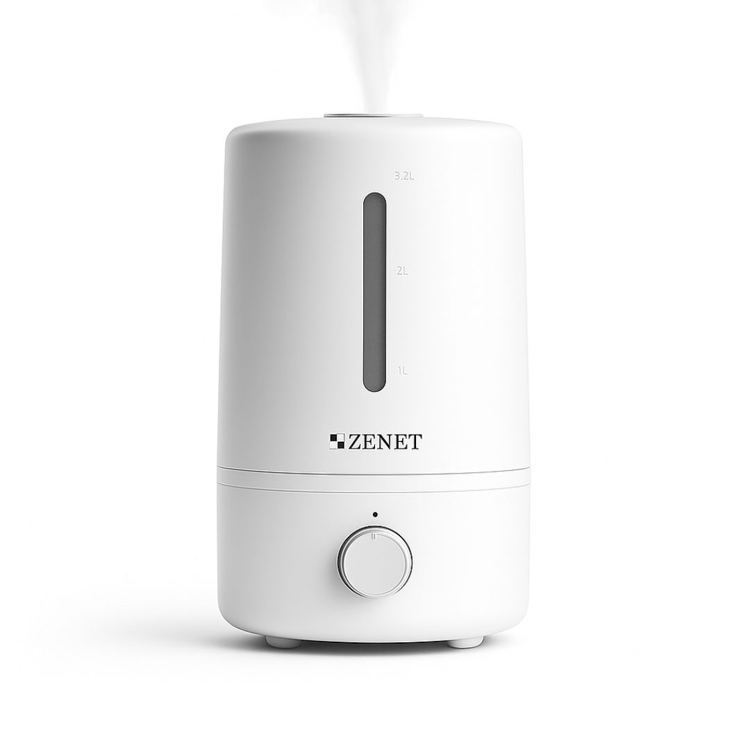 Резервоарът от 3.5–4 L осигурява продължителна работа, а производителността 220–300 ml/час помага срещу сух въздух, прах и дразнене на дихателните пътища. Работи изключително тихо (под 38 dB), подходящ за нощна употреба и детски стаи. 360° въртящ се накрайник разпределя равномерно парата, а автоматичното изключване при празен резервоар предпазва уреда.