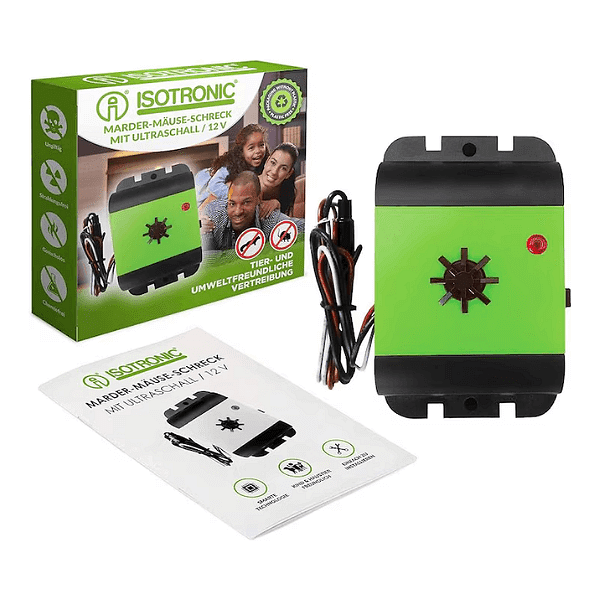 Уред с ултразвук против гризачи на кабели и маркучи. Ефективно прогонва гризачи като мишки, белки, златки, невестулки и порове. Работи с честота от 23 kHz ± 10%.Технически данни:Оперативно напрежение: 12 V DCКонсумирана мощност: около Честота: 23 kHz ± 10%Интервал на честотата: 15 секунди включен, 15 секунди изключенНиво на звука: около 85 dB ± 10%Ъгъл на излъчване: около 140 градусаМини предпазител: 250 V? 200 mAКонтролна лампа: LEDВодоустойчивост: IP54