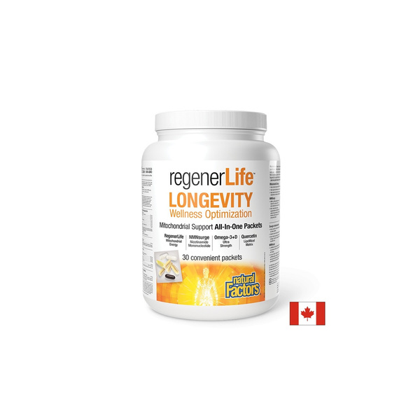 Тридесетдневната програма Longevity („Дълголетие“) е перлата в короната на подмладяваща серия Rеgener Life™ на канадската компания Natural Factors. Всяка дневна доза включва антиоксидантия комплекс RegenerLife Mitochondrial Energy (ацетил-L-карнитин, коензим Q10, полифенолния комплекс ElevATP, L-глутатион, супероксид дисмутаза), висока доза от никотинамид мононуклеотид (NMN Surge), Омега-3 + витамин D и Кверцетин Липомицел – фенолно съединение с антиоксидантно, противовъзпалително и противоалергично действие.