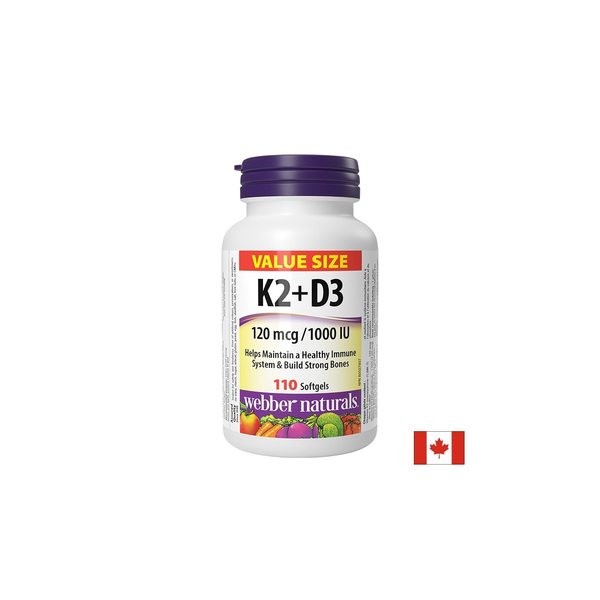 Витамин K2 120 µg + D3 1000 IU / 25 µg на канадската компания Webber Naturals e натурален продукт допринасящ за доброто състояние на костите, зъбите и ставите.
