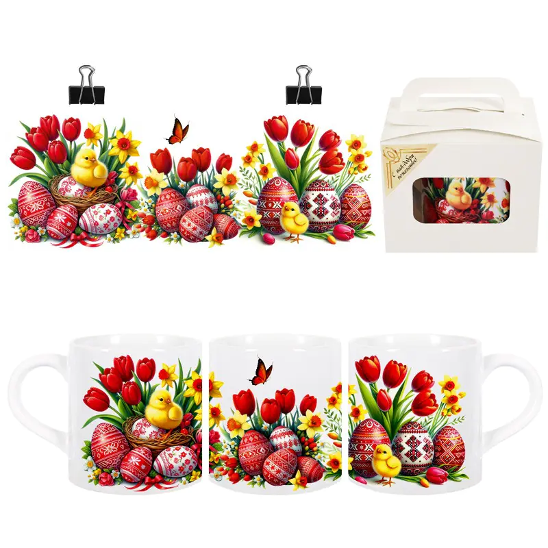 Великденска чаша с червени лалета поставена в красива подаръчна кутия.