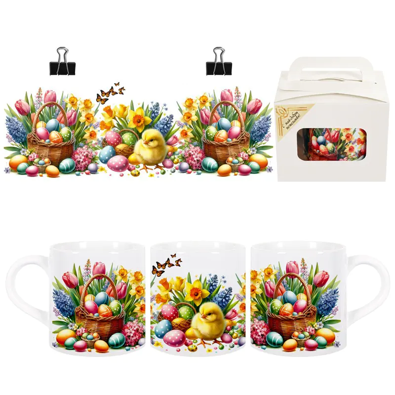 Великденска чаша с великденски яйца и цветя поставена в красива подаръчна кутия.