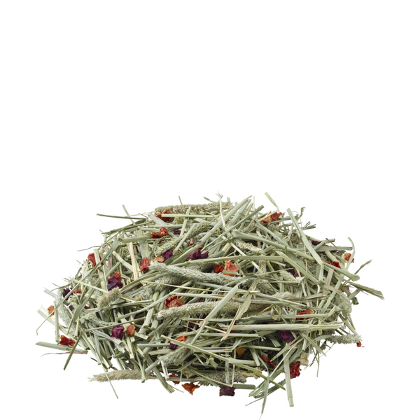 Вкусно ароматно сено с високо съдържание на сурови влакнини осигуряващи добро храносмилане и здрави зъби.
