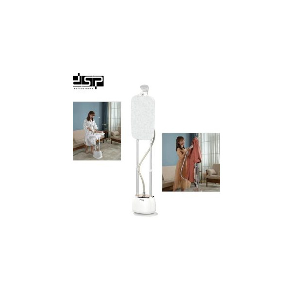 Вертикална система за парно гладене DSP, с висококачествена конструкция и висока производителност, подходяща за професионална употреба. Глади, дезинфекцира и освежава дрехите ви лесно и бързо, благодарение на четката с голяма повърхност и технологията с допълнителна проникваща пара, която премахва гънките на дрехите с едно минаване. Има вградена стойка-плоча за гладене за лесно гладене директно върху уреда.