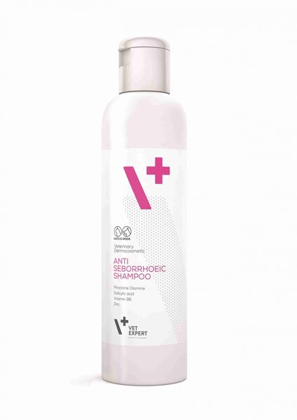 Vet Expert Antiseborrhoeic Shampoo е дермокозметичен шампоан за кучета и котки със склонност към себорея (суха или мазна) и пърхот (без бактериална инфекция). Активните съставки регулират себума, премахват мъртвите клетки и успокояват кожата, като възстановяват баланса и подобряват козината.